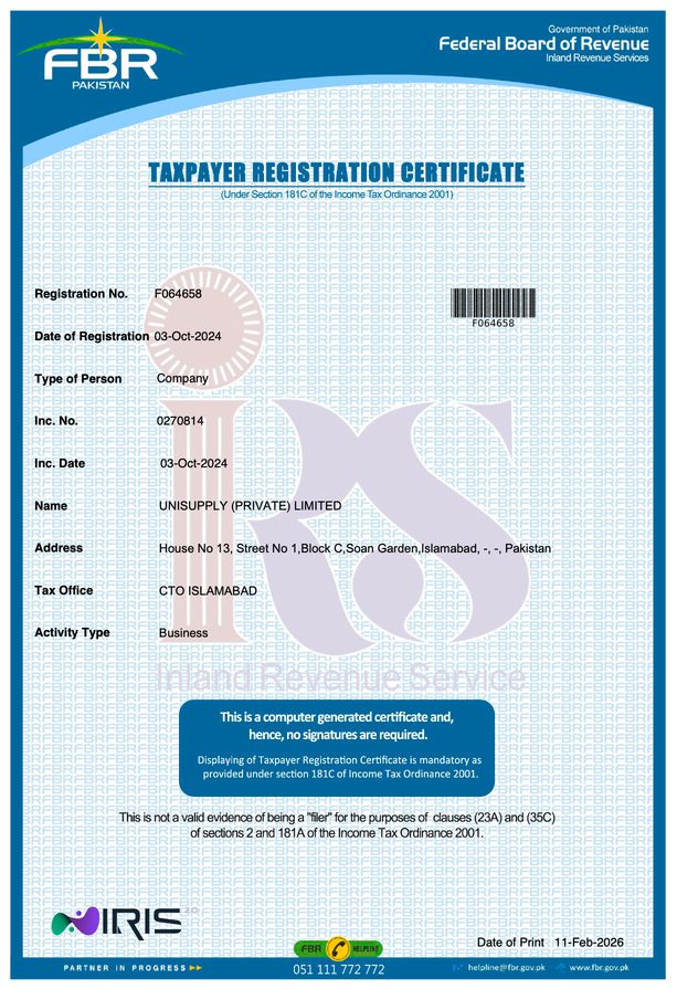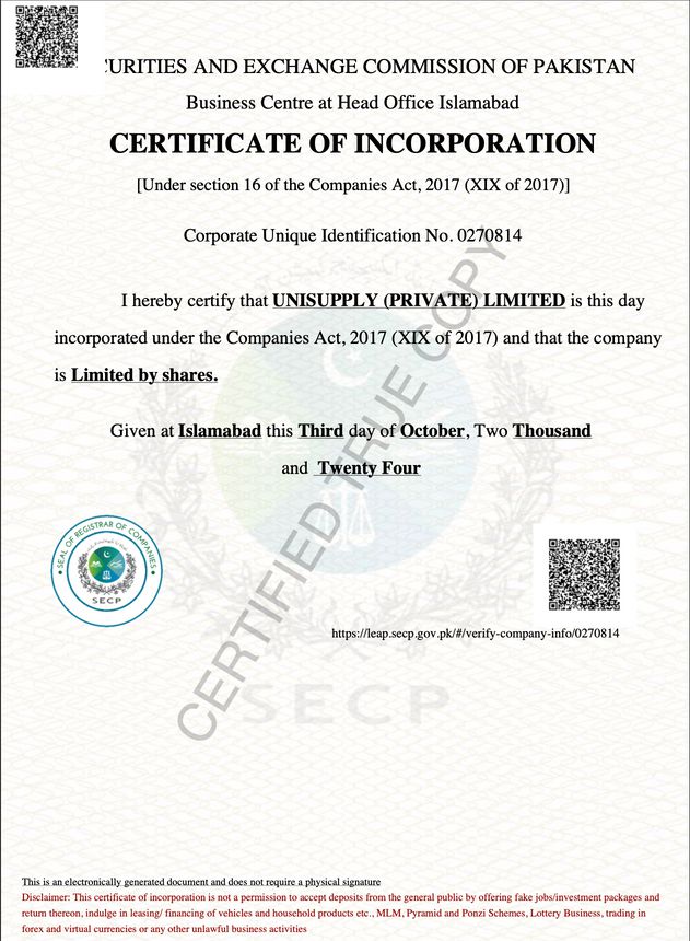 Unisupply (Pvt) Ltd is a duly registered company and operates in compliance with